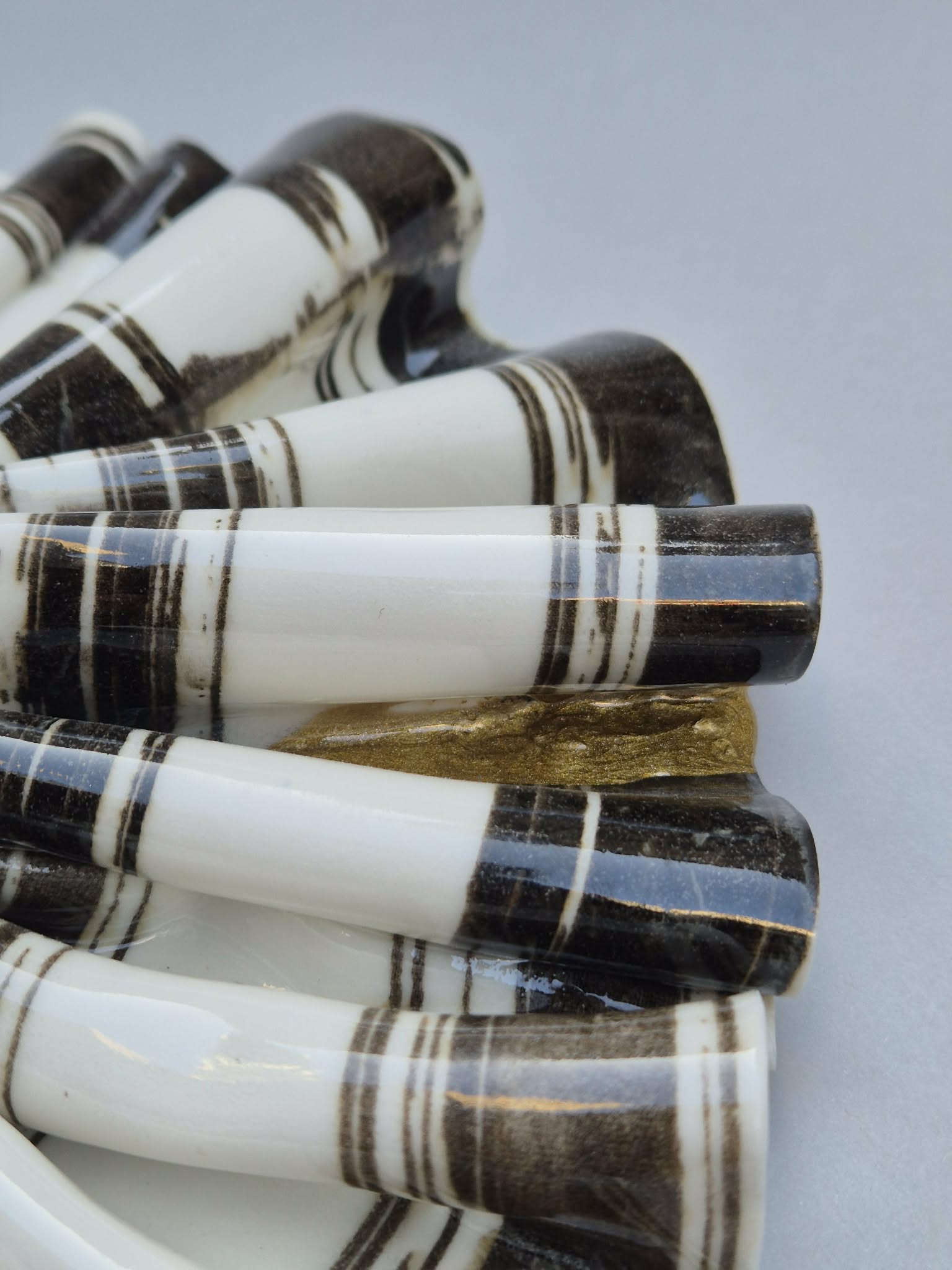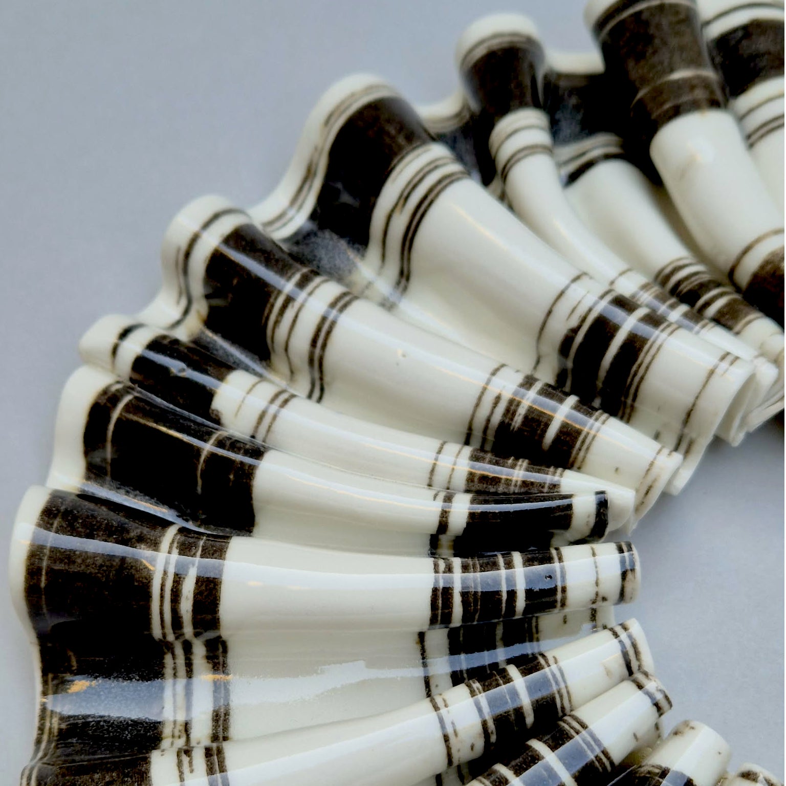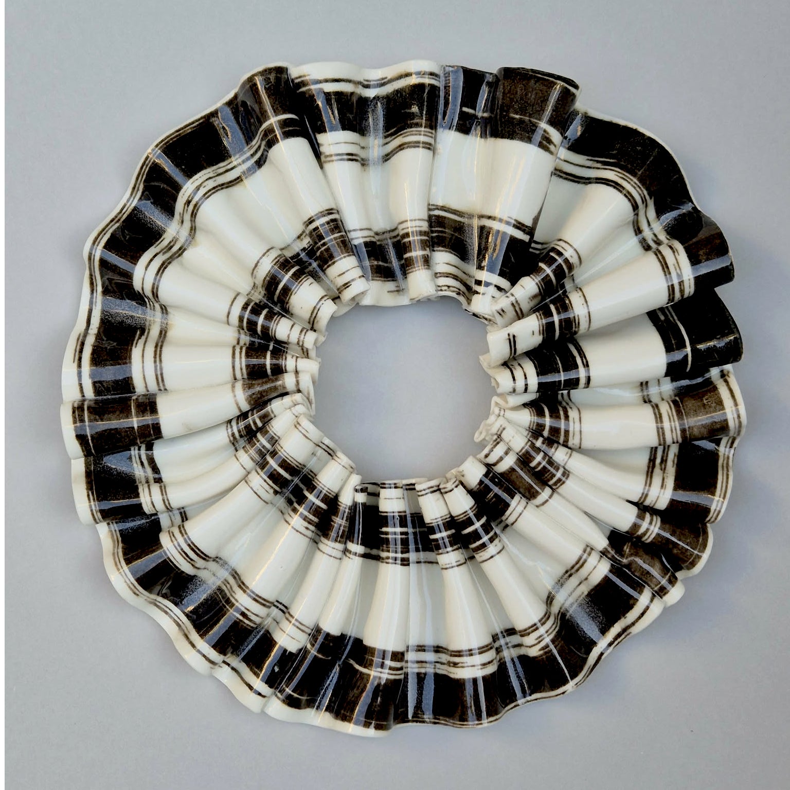 Fineste og "lidt skræve" sort og hvid stribet rosette med guld kintsugi, som både kan hænge på væggen og ligge på en flade. Det stribede mønster er lavet med silketryksramme. Værket kan danne associationer til foldet tekstil og syner blødt - men er det ikke..