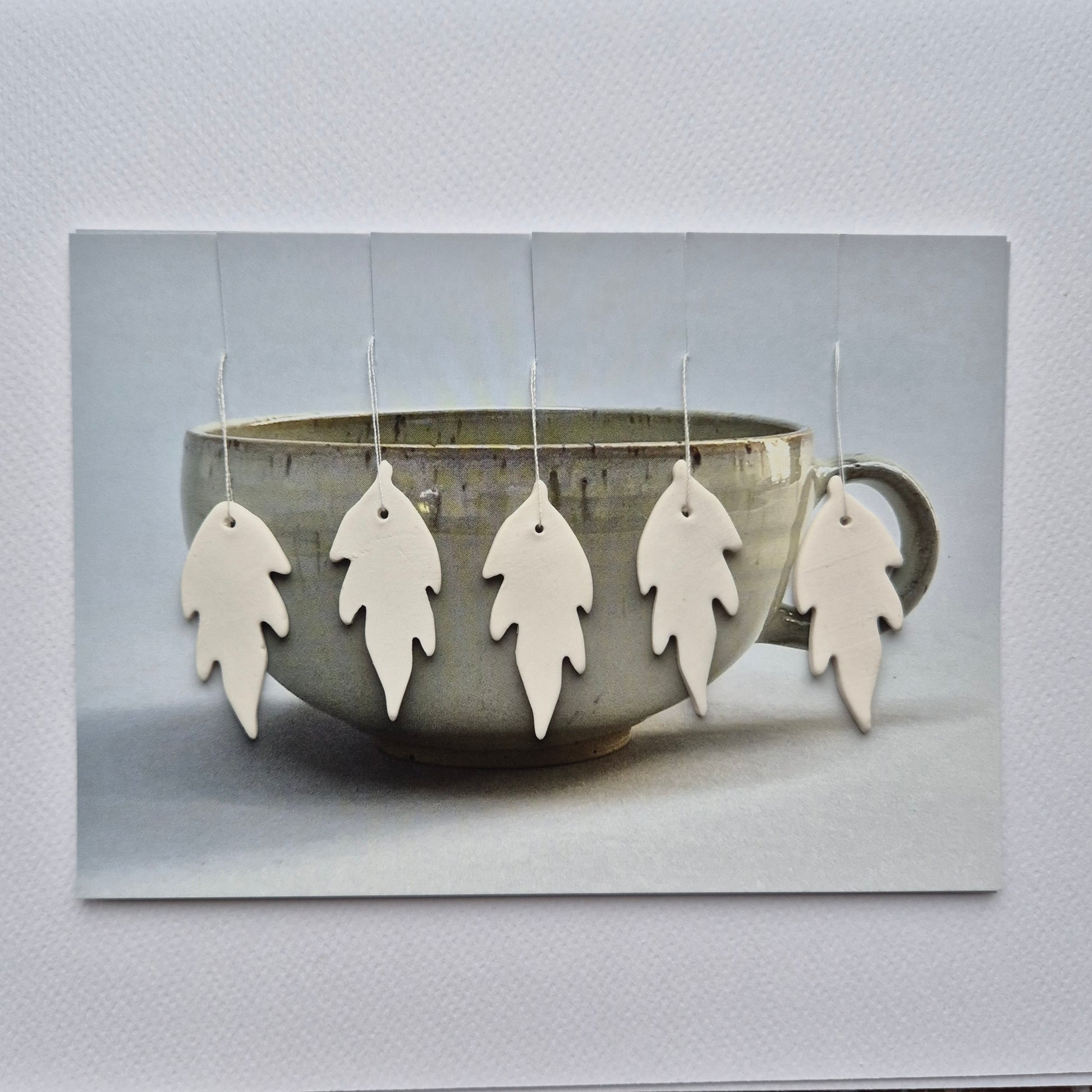 5 stk forårsblad i hvid porcelænsler. Sidder på et postkort som ligger i transparent plastlomme, perfekt og indbydende f.eks. som værtindegave. Mål: 4 cm. x 2 cm. tykkelse 2 mm.