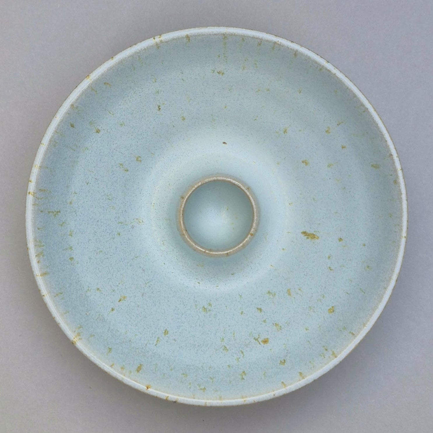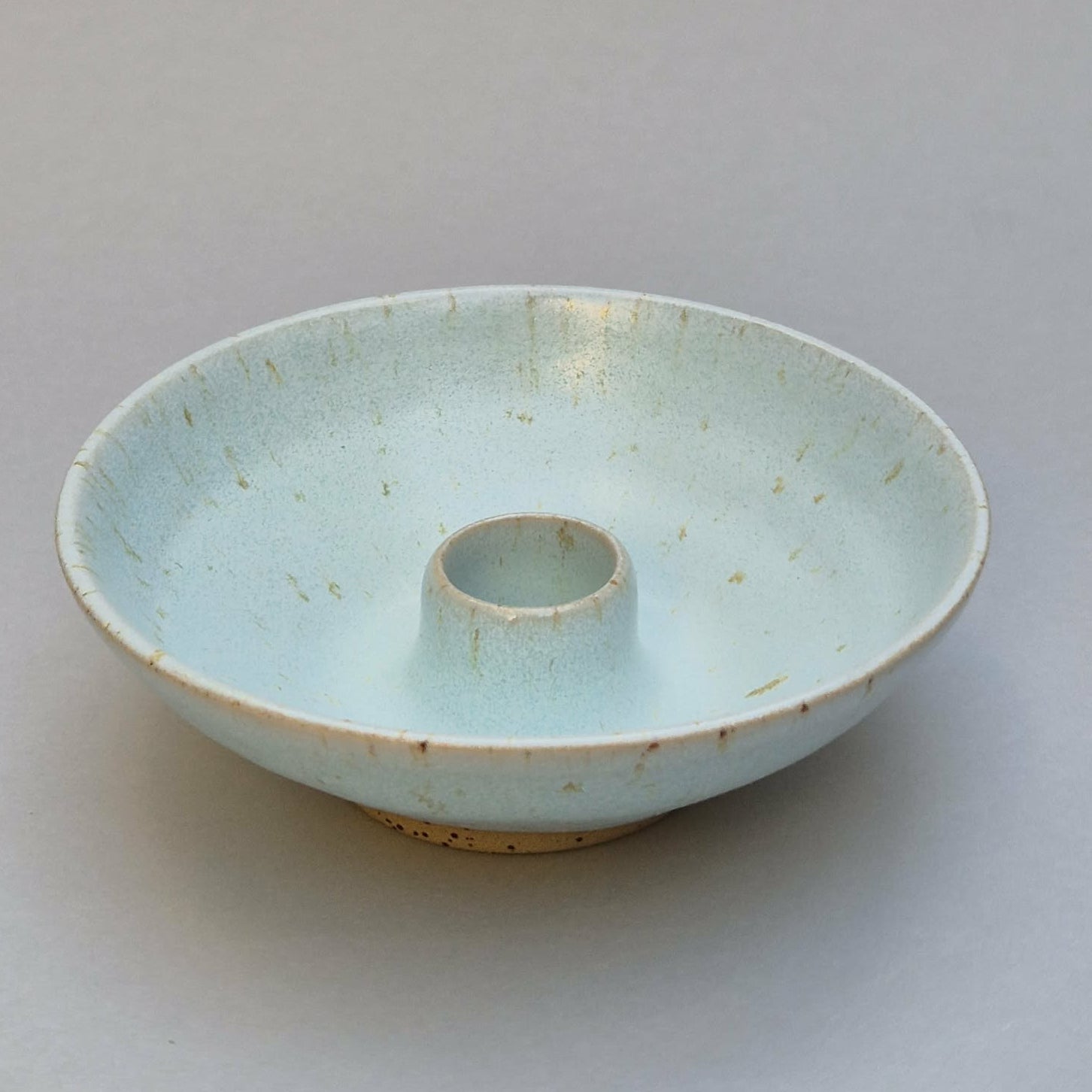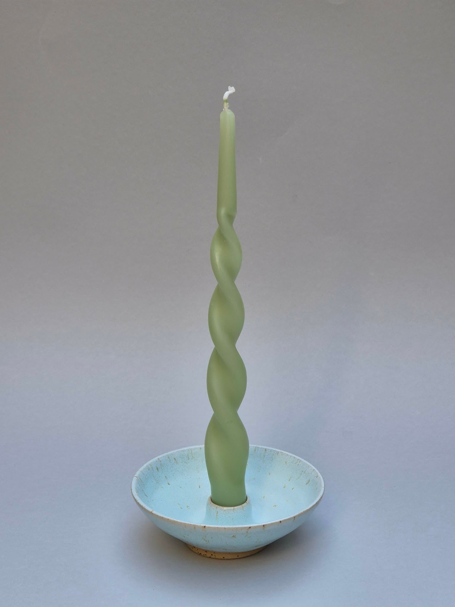 Hånddrejet lysestage i stentøjsler i lækker tyrkis farve med små bitte lavapletter, som fremstår under glasuren i små brun/sorte pletter. Passer til et kronelys eller et snoet lys.