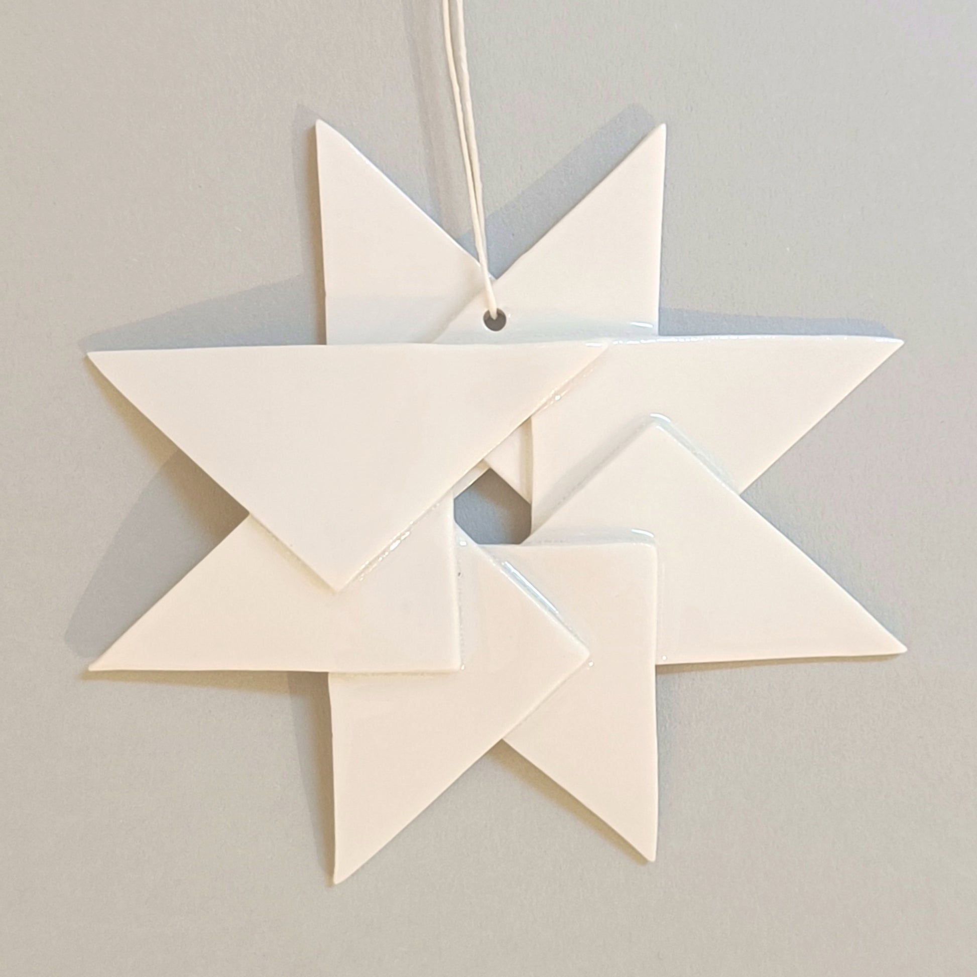 Denne smukke stjerne er lavet af porcelænsler, bestående af 8 trekantede plader af ler sammensat til stjerneform. Der er transparent glasur på den ene side og på undersiden er den uglaseret. Noel stjernen er opkaldt efter min søn som bærer samme navn, Noel betyder også jul på fransk.