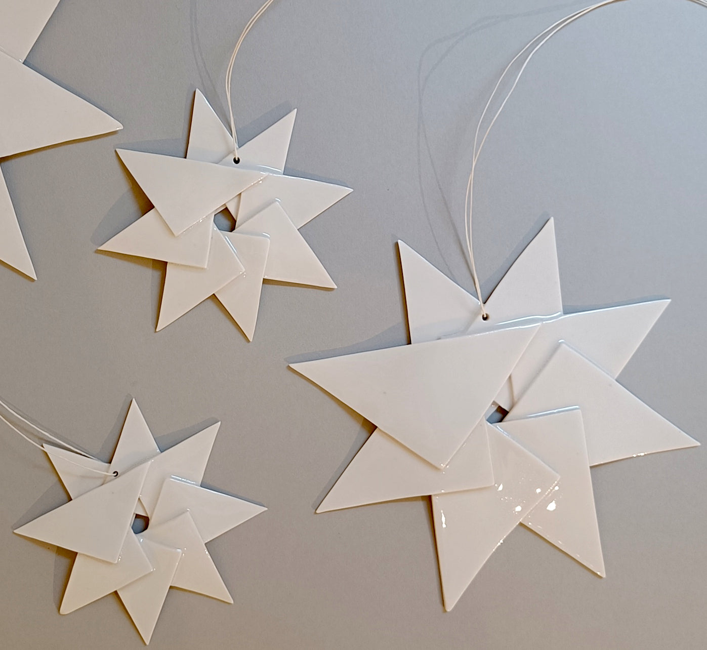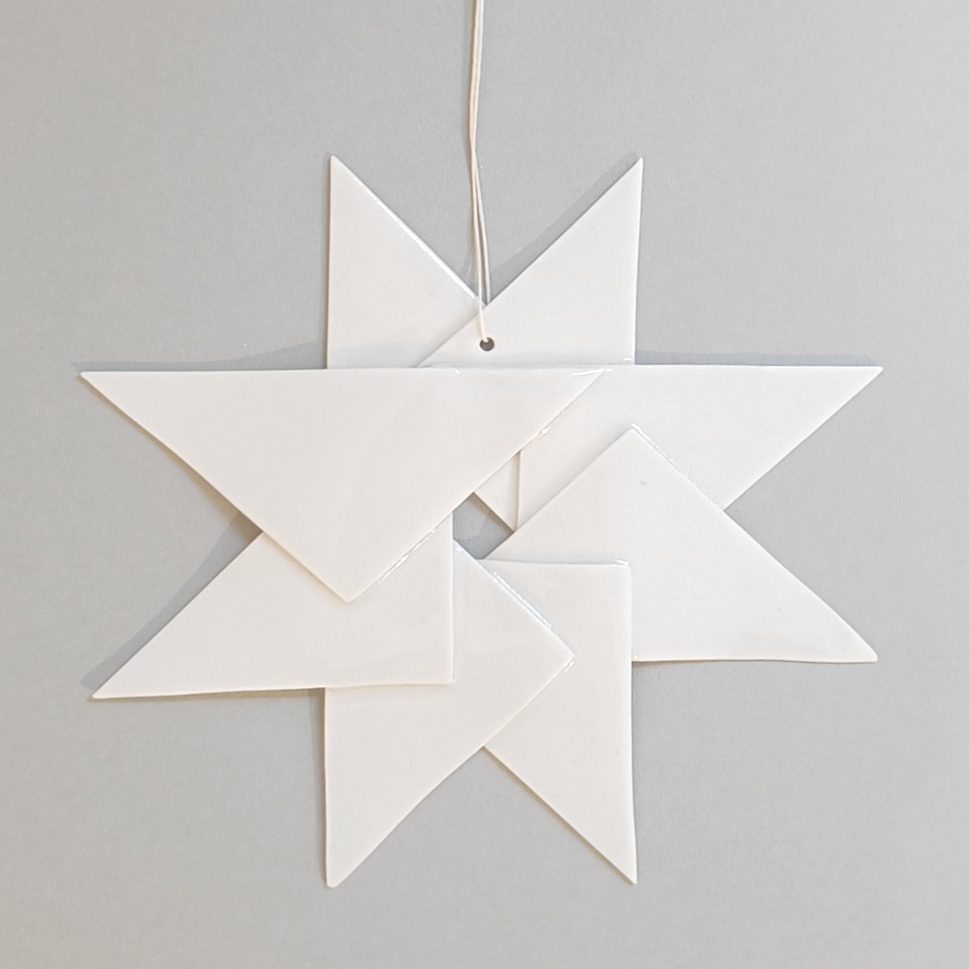 Denne smukke stjerne er lavet af porcelænsler, bestående af 8 trekantede plader af ler sammensat til stjerneform. Der er transparent glasur på den ene side og på undersiden er den uglaseret. Noel stjernen er opkaldt efter min søn som bærer samme navn, Noel betyder også jul på fransk.