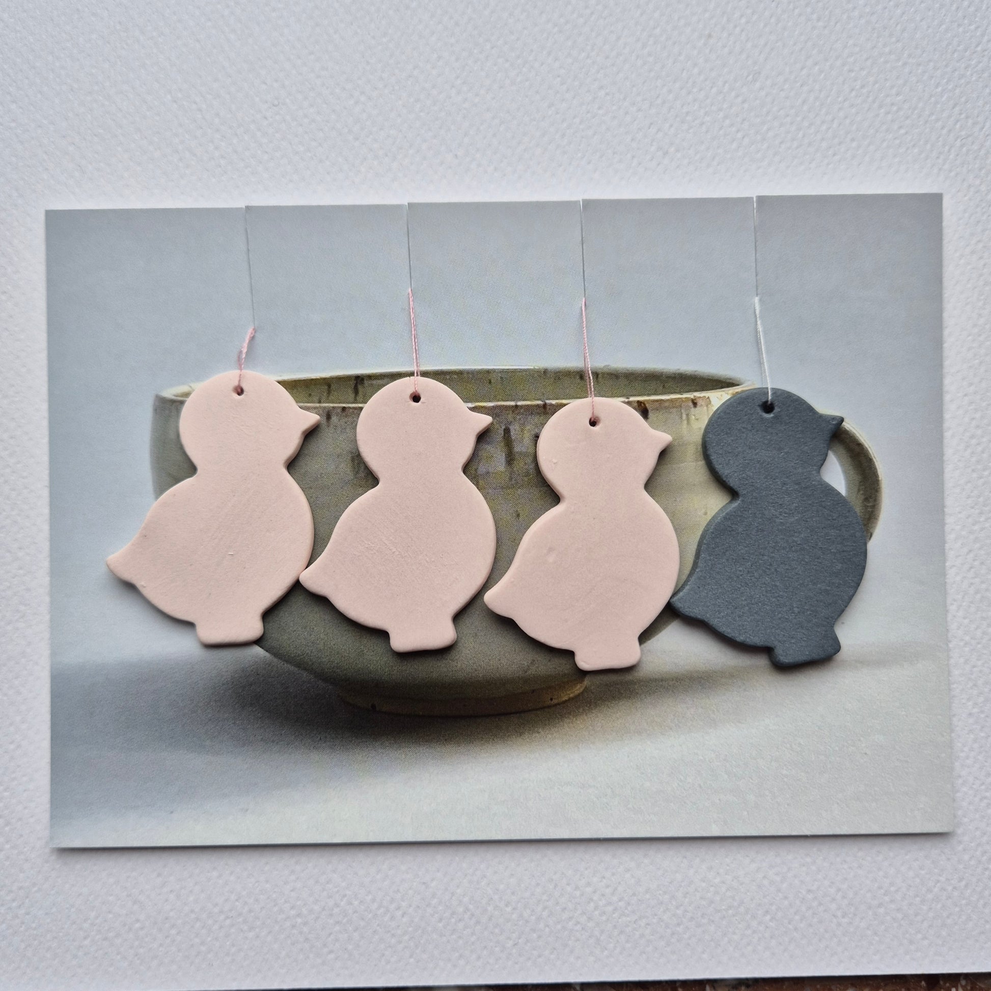 3 stk rosa påskekylling og 1 mørkegrå i indfarvet porcelænsler. Sidder på et postkort som ligger i transparent plastlomme, perfekt og indbydende f.eks. som værtindegave. Mål: 5 cm. x 3 cm. tykkelse 2 mm.