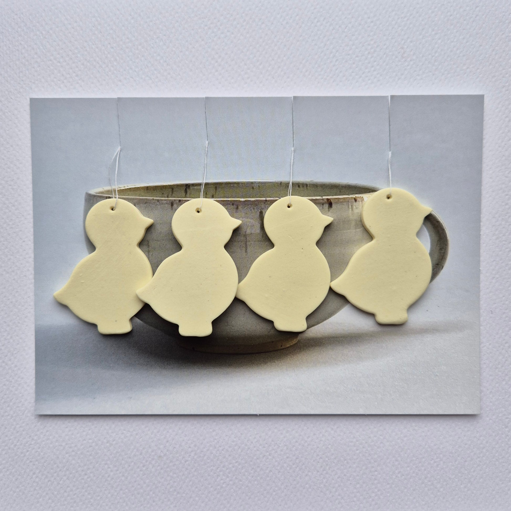 4 gule påskekylling i indfarvet porcelænsler. Sidder på et postkort som ligger i transparent plastlomme, perfekt og indbydende f.eks. som værtindegave. Mål: 5 cm. x 3 cm. tykkelse 2 mm.